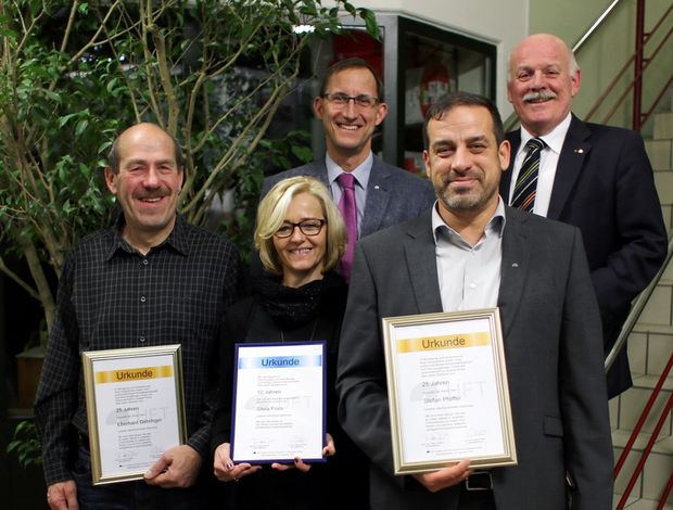 Die Jahresabschlussfeier bei UFT bot den Rahmen für die Ehrung von Mitarbeitern für ihre langjährige Betriebszugehörigkeit. Die beiden Geschäftsführer Dr.-Ing. Gebhard Weiß und Dipl.-Ing. Dieter Häußler freuten sich, fünf Mitarbeiter für insgesamt 90Jahre Treue ehren zu können.