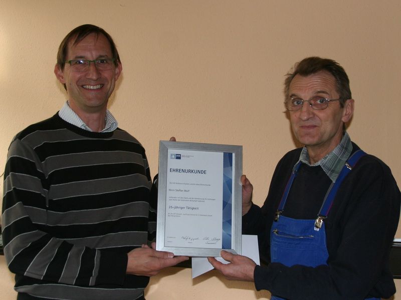 In einer kleinen Feierstunde dankte der Geschäftsführer Dr.-Ing. Gebhard Weiß dem Jubilar für seine langjährige Treue und überreichte eine Ehrenurkunde der IHK.