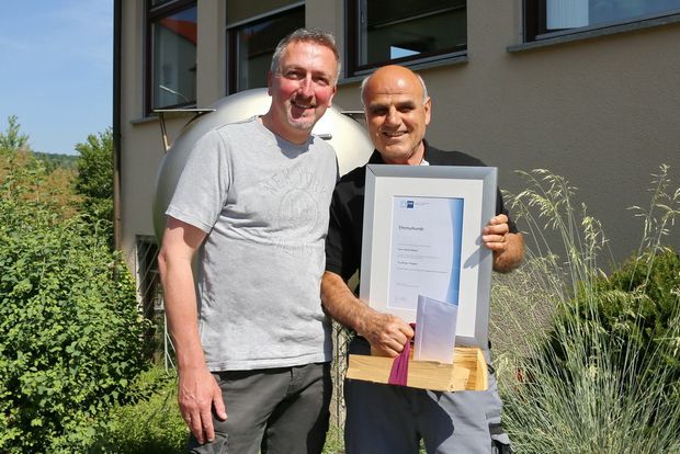 Der Prokurist Michael Drechsler bedankte sich in einer kleinen Feierstunde bei Daniel Oshana für die langjährige Treue und die Zuverlässigkeit und für die weiten Wege, die er zur Anfahrt nach Bad Mergentheim auf sich nimmt. "Wir wissen Ihren reichen Erfahrungsschatz sowie die Ruhe und Gelassenheit, mir der Sie Ihre Aufgaben angehen, sehr zu schätzen" hob Drechsler in seiner Laudatio hervor.