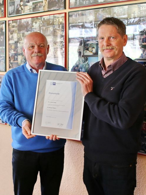 Bei einer internen Feierstunde lobte der Geschäftsführer Dieter Häußler die langjährige Treue des Jubilars und überreichte ihm die Ehrenurkunde der IHK Heilbronn-Franken.