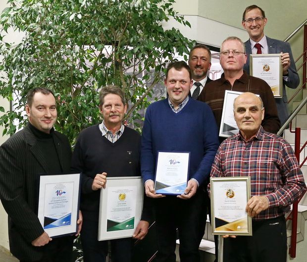 Für zehnjährige Betriebszugehörigkeit wurde Ralf Herrmann geehrt, für 20 Jahre Rainer Hammer, für 25 Jahre Daniel Oshana und Dr. Gebhard Weiß und für 35 Jahre Treue zu UFT Armin Schütz.