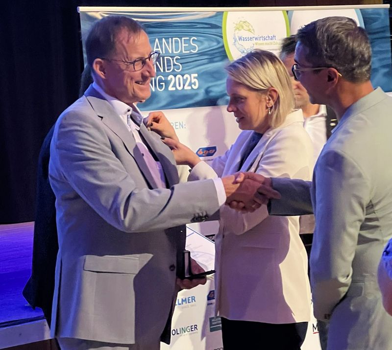 Dr. Gebhard Weiß durfte bei der festlichen Abendveranstaltung aus der Hand der Sprecherin der DWA-Bundesgeschäftsführung, Frau Dr. Lisa Broß, die DWA-Ehrennadel entgegennehmen. Mit dieser seltenen Anerkennung zeichnet die DWA Mitglieder aus, die „die Vereinigung durch intensive und herausragende Tätigkeit gefördert haben“. Wie der Landesverbandsvorsitzende Boris Diehm in seiner Laudatio herausstellte, würdigt die Ehrennadel Gebhard Weiß‘ langjähriges Engagement in der Regenwasserbehandlung als Wissenschaftler, Mitglied mehrerer Arbeitsgruppen, Vortragender und auch durchaus kritischer Vermittler der nicht immer ganz einfachen Thematik.