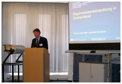 Die Referenten Prof. Dr.-Ing. Hubertus Milke, Prof. Dr.-Ing. Hansjörg Brombach, Dr.-Ing. Gebhard Weiß und Dipl.-Ing. Daniel Lübke informierten die gut sechzig Gäste über den Stand der Regenwasserbehandlung in Deutschland, über Konzepte und Grundlagenermittlung für die Planung, über hydraulische Aspekte beim Entwurf von Regenbecken und über die apparative Ausrüstung.