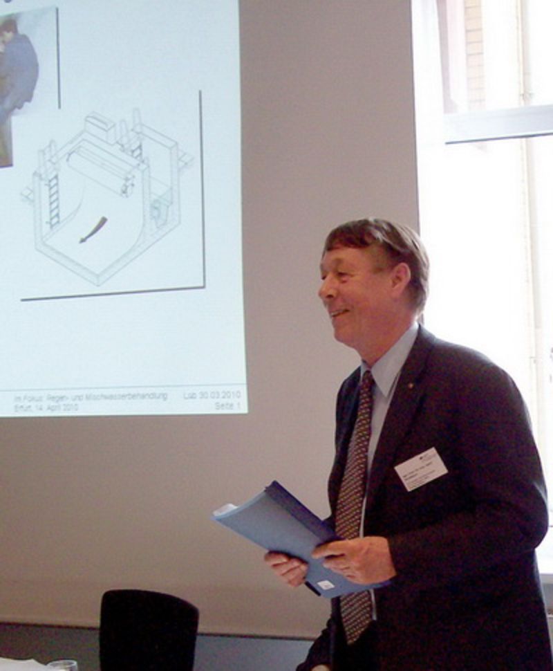 Die Referenten Prof. Dr.-Ing. Jörg Londong, Prof. Dr.-Ing. Hansjörg Brombach, Dr.-Ing. Gebhard Weiß und Dipl.-Ing. Daniel Lübke informierten die gut siebzig Gäste in fünf Vorträgen über Anforderungen an den Umgang mit Regenwasser aus Sicht des Gewässers, über den Stand der Regenwasserbehandlung in Deutschland, über Konzepte der Entwässerungssysteme und Regenwasserbehandlung, über hydraulische Aspekte der Gestaltung von Regenbecken und über die apparative Ausrüstung.