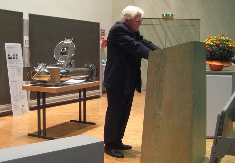 Nach seinem dem Jubilar gewidmeten Fachvortrag überreichte Prof. Dr. Brombach, der Gründer unserer Firma, der Universität Stuttgart als Dank für die nun weltweit über 20.000 in Betrieb befindlichen Wirbeldrosseln und -ventile eine „Gedenk-Wirbeldrossel“. Diese hängt seit dem 25. Oktober 2012 im Treppenhaus des IWS.