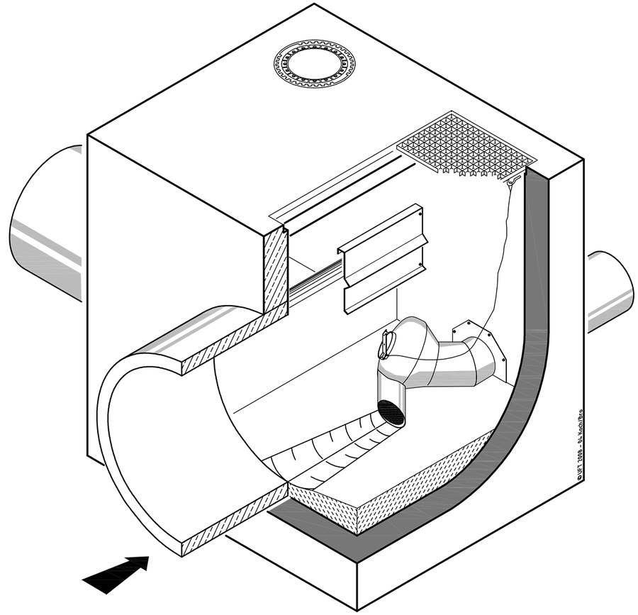 Im Gegensatz zu den Wirbelventilen in trockener Aufstellung ist für die Wirbelventile in nasser Aufstellung kein separater Drosselschacht erforderlich. Das Wirbelventil wird zum Beispiel am Ende eines Stauraumkanals direkt vor die weiterführende Leitung gedübelt.