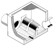 Selbsttätige, ohne Fremdenergie wirkende Überfallklappe als platzsparende Konstruktion mit Federmechanik. Zur Stauraumaktivierung, zur Vermeidung von Rückstau ins Kanalnetz bei Regen und zur Regelung des Oberwasserspiegels auf ein praktisch konstantes Niveau.