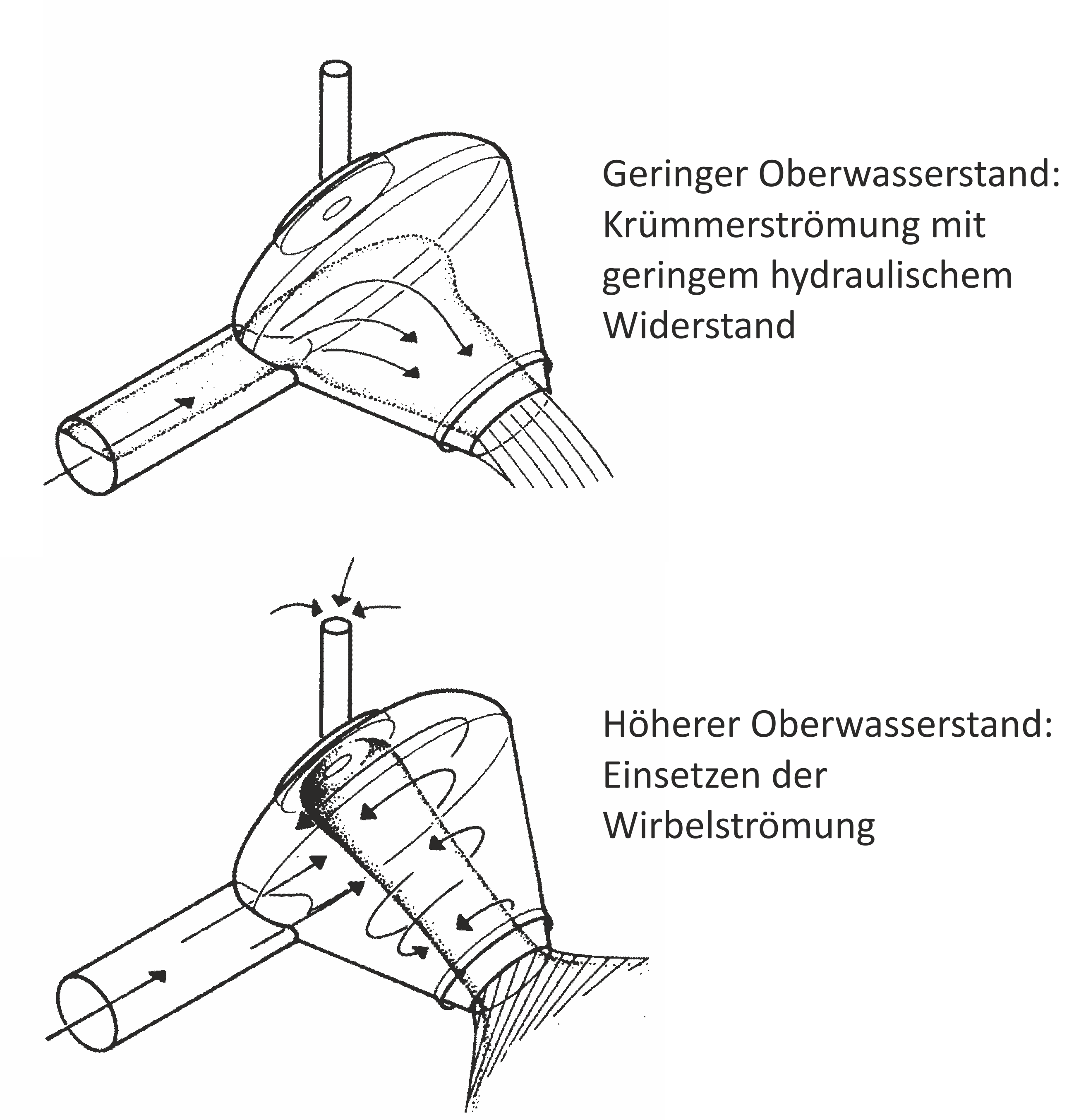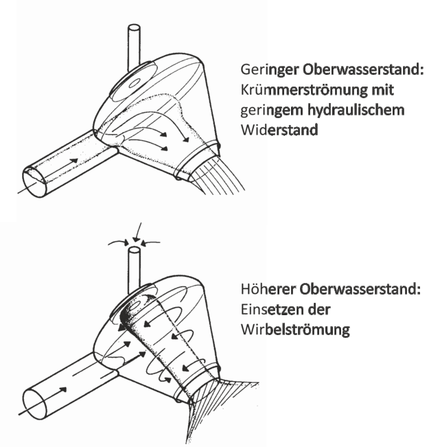 Die Abflusssteuerung geschieht hier nicht zum Zweck, einen konstanten Abfluss zu erhalten; vielmehr stellen sich wasserstandsabhängig unterschiedliche Strömungsformen ein. Bei geringem Wasserstand (also etwa bei Trockenwetter und leerem Becken) fließt das Wasser durch das Gerät, ohne dass eine Wirbelströmung einsetzt. Der hydraulische Widerstand ist in diesem Fall gering, es fließt ein relativ großer Abfluss ohne nennenswerten Einstau hindurch, was zur Vermeidung von Ablagerungen im Zulauf wünschenswert ist. Füllt sich das Regenbecken, so startet die Wirbelströmung, der Drosseleffekt setzt ein und der Abfluss geht zurück. Diese Änderung des hydraulischen Verhaltens abhängig vom Wasserstand erfolgt nur aufgrund hydromechanischer Effekte.